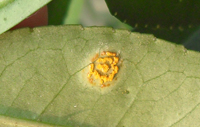 主要為害成熟或近成熟葉片。葉片染病葉背面現(xiàn)黃色、裸露的夏孢子堆,大小0.2—0.4mm,圓形至橢圓形,包被破裂后變?yōu)槌赛S色,后又褪為淺黃色,在與夏孢子堆對(duì)應(yīng)的葉正面現(xiàn)紅褐色斑塊,秋后又形成冬孢子堆,圓形,大小0.2—0.7mm,橙黃色至暗黃色,嚴(yán)重時(shí)孢子堆擴(kuò)展至全葉。