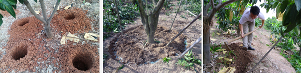 為了促進(jìn)芒果根系正常生長(zhǎng)和再生,在不同時(shí)期應(yīng)對(duì)果園做深耕和翻土處理。冬季(或采果修剪后)應(yīng)結(jié)合深翻改土,沿樹(shù)冠垂直線下挖(60cm深、30cm寬)環(huán)溝、對(duì)溝或圓形溝,切斷土壤下層的粗根,經(jīng)曬五、六天,然后施采果肥,用表土和植物殘?bào)w加以回填。結(jié)合清園,進(jìn)行中耕翻土(20cm深),以切斷表土的吸收根,減弱地下部分對(duì)地上部分水分和養(yǎng)分輸送,有利地上部分營(yíng)養(yǎng)物質(zhì)積累,促進(jìn)花芽分化。