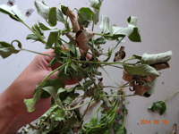 癥狀:花生青枯病是典型的維管束病害,主要自花生根莖部開始發(fā)生。特征性癥狀是植株急性凋萎和維管束變色。該病從苗期至收獲期均可發(fā)生,以盛花期最多。感病初期通常是主莖頂梢葉片失水萎焉,早晨葉片張開晚,傍晚提早閉合。隨后病勢發(fā)展,全株葉片自上而下急劇凋萎,整個(gè)植株青枯死亡。拔起病株,主根尖端變褐濕腐,縱切根莖可見維管束變黑褐色,條紋狀,后期病株髓部呈濕腐狀,擠壓切口處,有白色的菌膿溢出。
