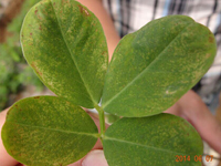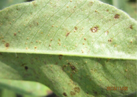 癥狀:花生銹病在各個(gè)生育階段都可發(fā)生,但以結(jié)莢期以后發(fā)生嚴(yán)重。主要侵染花生葉片,亦可為害葉柄、托葉、莖稈、果柄和莢果。葉片染病初在葉片正面或背面出現(xiàn)針尖大小淡黃色病斑,后擴(kuò)大為淡紅色突起斑,表皮破裂露出紅褐色粉末狀物,即病菌夏孢子。下部葉片先發(fā)病,漸向上擴(kuò)展。葉上密生夏孢子堆后,很快變黃干枯,似火燒狀。葉柄、托葉、莖、果柄和果殼染病夏孢子堆與葉上相似,托葉上的夏孢子堆稍大;葉柄、莖和果柄上的夏孢子堆橢圓形,長1~2mm,但夏孢子數(shù)量較少。