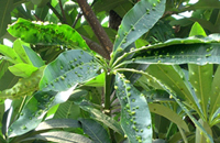 盆架子木虱,刺吸式口器害蟲,屬同翅目、木虱科昆蟲,也是一種典型的造癭昆蟲。在廣東、海南、福建地區(qū)的盆架子上危害較重。受危害的盆架子,葉片正反面突起呈囊狀蟲癭(見圖1)。 葉片卷曲,皺縮。若蟲分泌蜜露堵塞葉片的氣孔,既嚴(yán)重影響葉片的光合作用和呼吸租用,還容易誘發(fā)煤污病,影響植株正常生長,降低其觀賞價值。