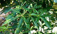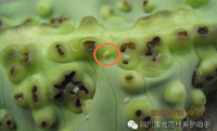 圖4.用藥前 圖5、用藥后(有效防治的表現(xiàn):老葉的“包狀物”不會消失,但其不再變大,且不穿孔;新葉在生長至老葉的過程中幾乎不再形成“包狀物”,恢復(fù)正常生長)