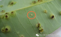 圖2.從“包狀物”內(nèi)剝離出的木虱幼蟲(圓圈內(nèi)) 圖3.木虱成蟲(圓圈內(nèi)),黑色小孔為羽化孔